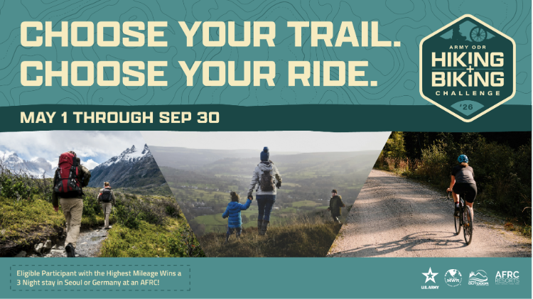 The 2026 Army Outdoor Recreation (ODR) Hiking & Biking Challenge is your chance to explore the outdoors, build fitness, and earn exclusive awards - all while representing your garrison in an Army MWR wide event. Whether you ride, hike, or do both, this five‑month challenge is designed for every skill level and every member of the MWR community.