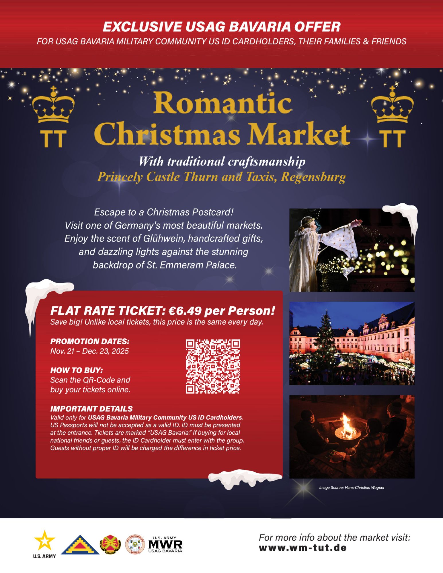Get ready to escape to a fairytale setting this holiday season! USAG Bavaria has partnered with the spectacular Romantic Christmas Market at Princely Castle Thurn and Taxis in Regensburg to bring our community an incredible, exclusive discount.