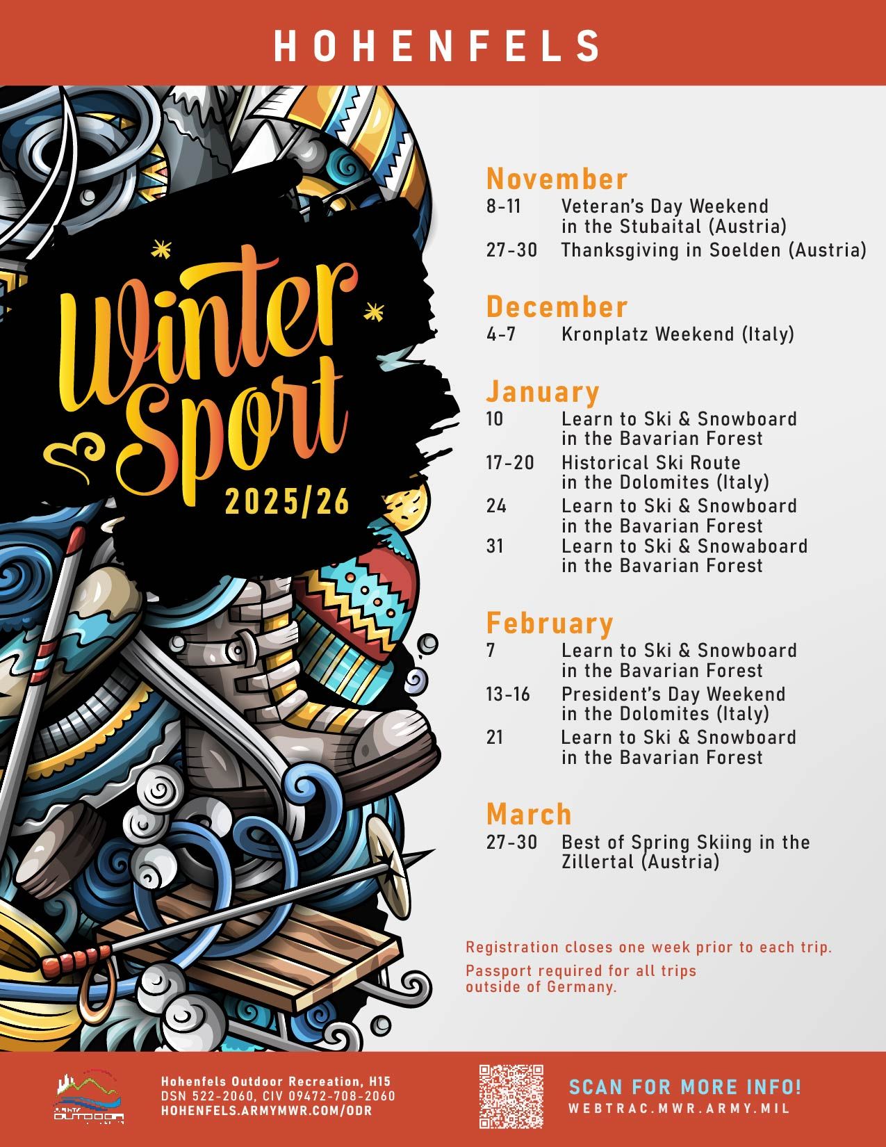 One can sign up by coming in to our colorful, comfy Outdoor Recreation Center in Bldg H15 behind the Java Café and Bowling Center or by calling 09472 83 2060. We accept VISA, Mastercard, American Express, Cash and Check. Stay tuned for WebTrac.